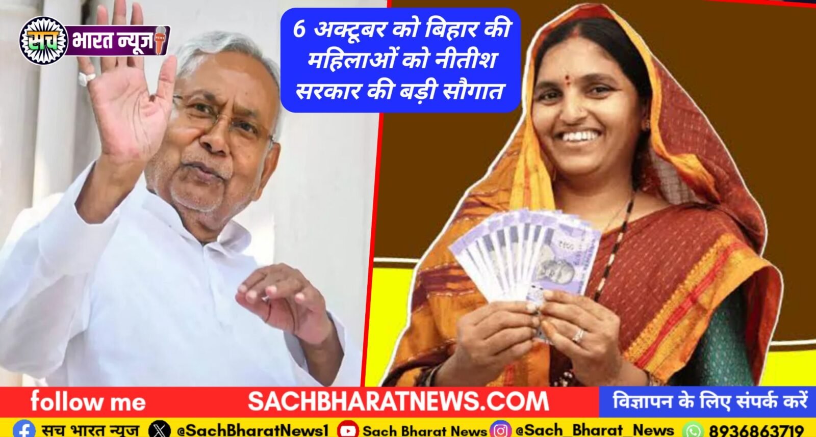 पटना – बिहार सरकार की महत्वाकांक्षी योजना “मुख्यमंत्री महिला रोजगार योजना” के तहत 6 अक्टूबर को मुख्यमंत्री नीतीश कुमार राज्य की 21 लाख महिलाओं को बड़ी आर्थिक सहायता प्रदान करने जा रहे हैं। इस दिन पात्र लाभार्थियों के बैंक खातों में ₹10,000 की राशि सीधे ट्रांसफर की जाएगी।