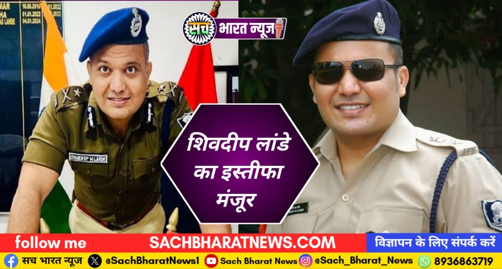 IPS शिवदीप लांडे का इस्तीफा मंजूर कर लिया गया है। राष्ट्रपति द्रौपती मुर्मू ने इस्तीफा मंजूर कर लिया है। राष्ट्रपति भवन ने इसको लेकर अधिसूचना जारी कर दिया है। केंद्रीय गृह मंत्रालय की भी अधिसूचना जारी हुई है। शिवदीप लांडे ने 19 सितंबर 2024 को निजी कारणों से इस्तीफा दिया था। शिवदीप लांडे के इस्तीफा के बाद पुलिस मुख्यालय ने पूर्णिया रेंज के आईजी पद से पुलिस ट्रेनिंग का आईजी बना दिया था। शिवदीप लांडे 2006 बैच के IPS अधिकारी है।